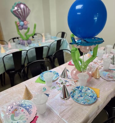 Celebrate your special day in our private party room, a bright and cheerful space made for making memories. The room includes two tables with seating for 16 guests, plus extra chairs and stools so everyone feels welcome. A spacious counter gives you plenty of room for cake, food, and decorations. Perfect for creating your own celebration style. Every party rental includes unlimited playtime in our indoor play area for all your little guests.